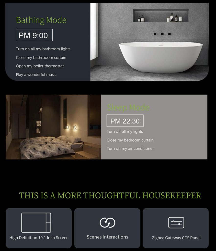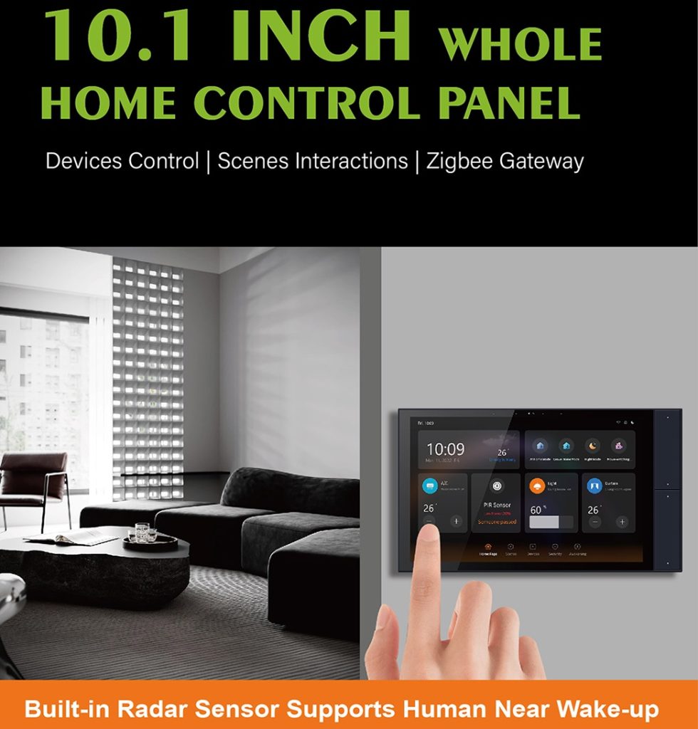 S9E 10.1” Smart Home Automation Control Touch Panel with Wifi Zigbee Gateway for Scenes Control, built-in quadruple array microphones, 4 ohm 2W*2 Mono speakers, light sensor, proximity sensor, temperature & humidity sensor.