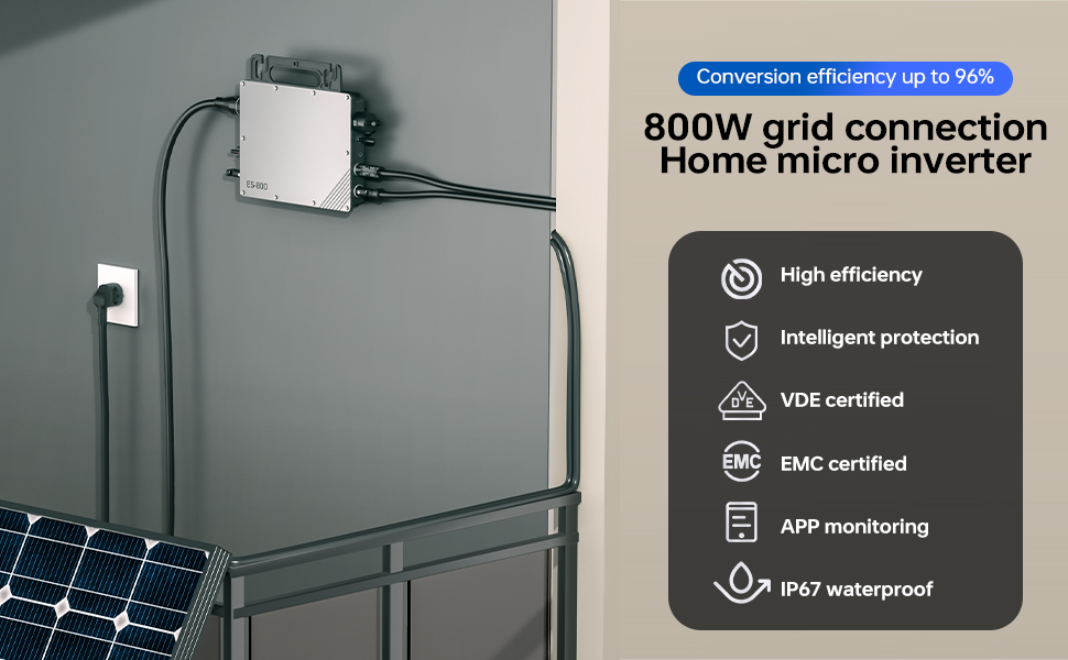 - 800W Mains Coupled Micro Inverter for Home Use with APP Monitoring, High Efficiency, Intelligent Protection, VDE/EMC Certification, IP67 Protection Class
