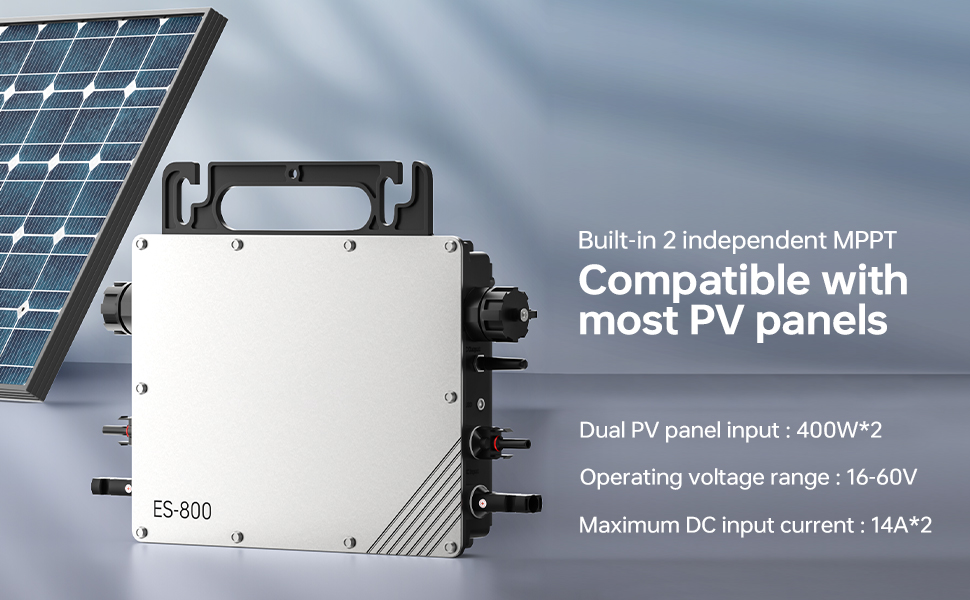 - High Efficiency: Two independent MPPT (400W*2) integrated, compatible with most photovoltaic panels, can be used with photovoltaic energy storage systems, conversion efficiency up to 96%, five hours of sunlight equivalent to 4kWh, significantly reduced heat generation, operating voltage 18-55V, maximum DC input current 14A*2