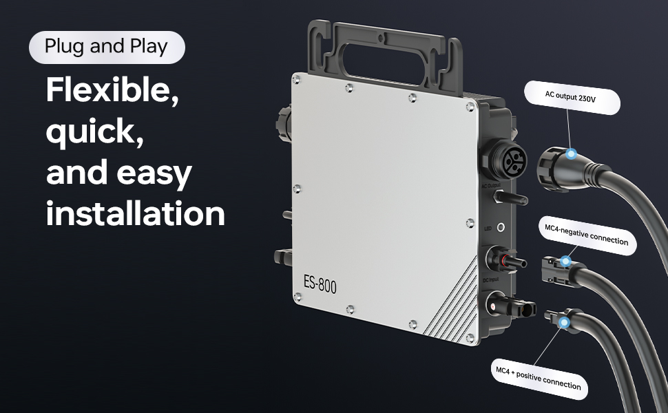 | Flexible, quick and easy installation | AC output: 230 V | EFFISolax | MC4 negative connector | ES-800 | MC4+ positive connector |